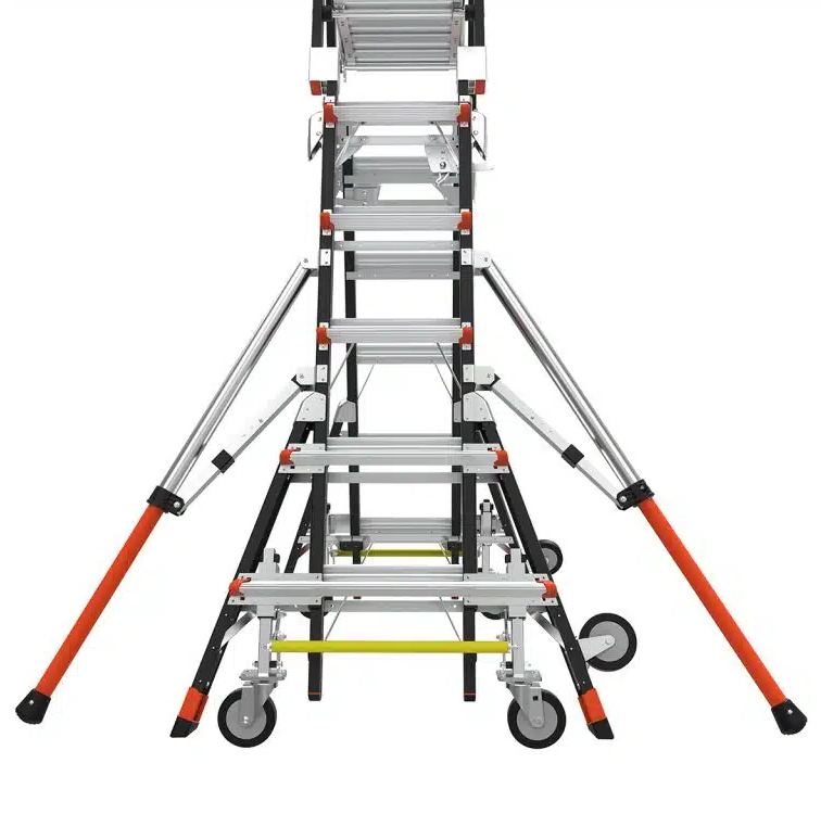 The Adjustable Safety Cage is the safest, most versatile and cost-effective option when performing difficult tasks in challenging environments. OH&S rules & regulations demand professionals working at heights must tie off at secure anchor points before performing tasks. These standards make it extremely difficult or impossible to undertake, forcing operators to put themselves in hazardous positions. Until now, operators have had no option other than to use heavy, bulky scaffolding that is expensive and, most of all, consuming. Cherry pickers or hydraulic lifts are options that share similar frustrations. The Little Giant Adjustable Safety Cage is made of high-strength, non-conductive fibreglass resin composite. Each side adjusts independently in one-foot increments, allowing the operator to reach a suitable safe height. The Cage can be used on stairs or sloping ground that scaffolding or mechanical lifts can’t enter. The fully enclosed work platform allows the operator to work safely in a 360-degree workspace with no need to tie off. The Cage comes standard with Wheel Lift castors, allowing you to wheel The Cage around whilst in maximum height deployment. Model 5-9 comes with Outriggers, which can be deployed for extra stability and safety.
